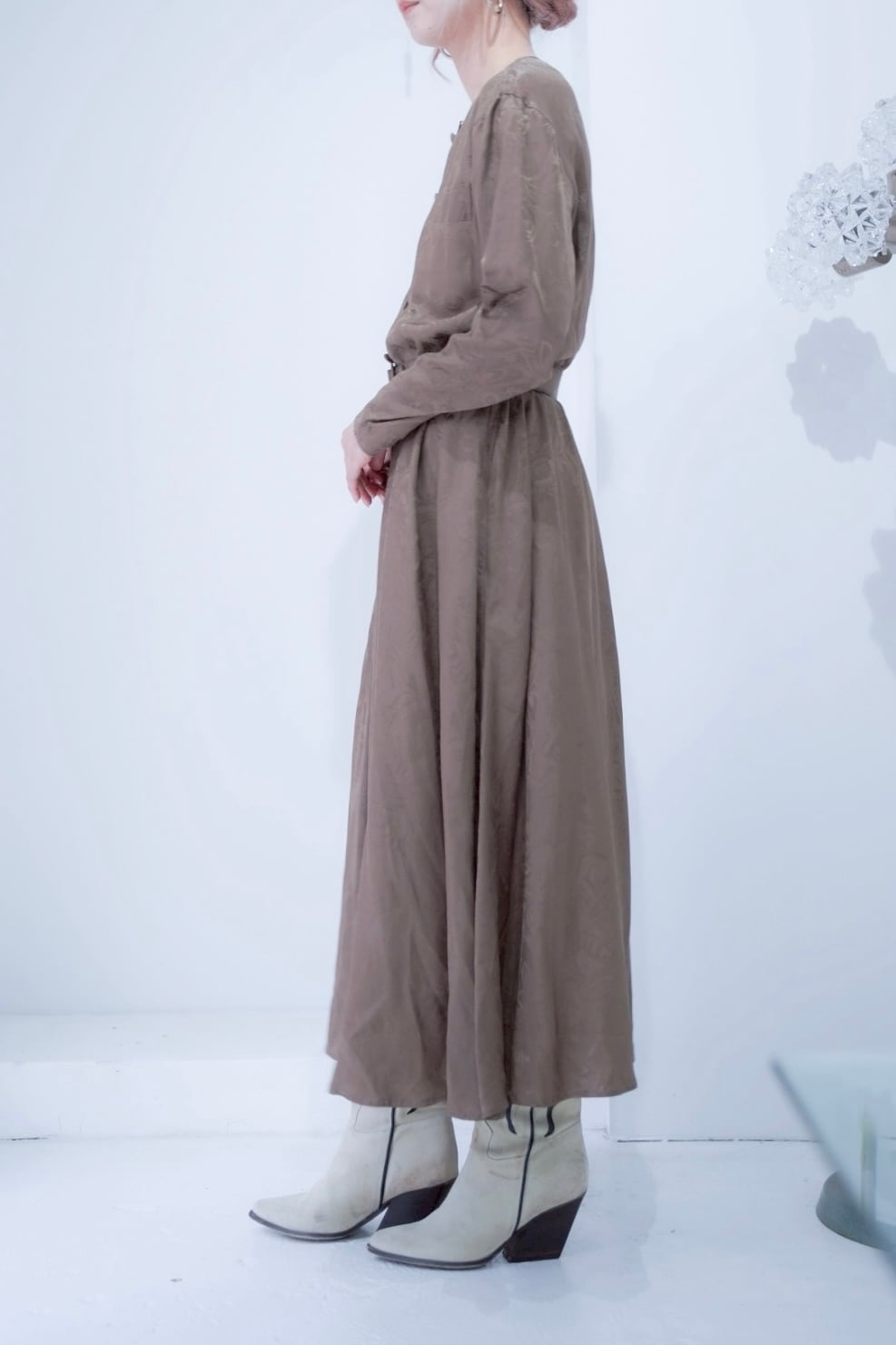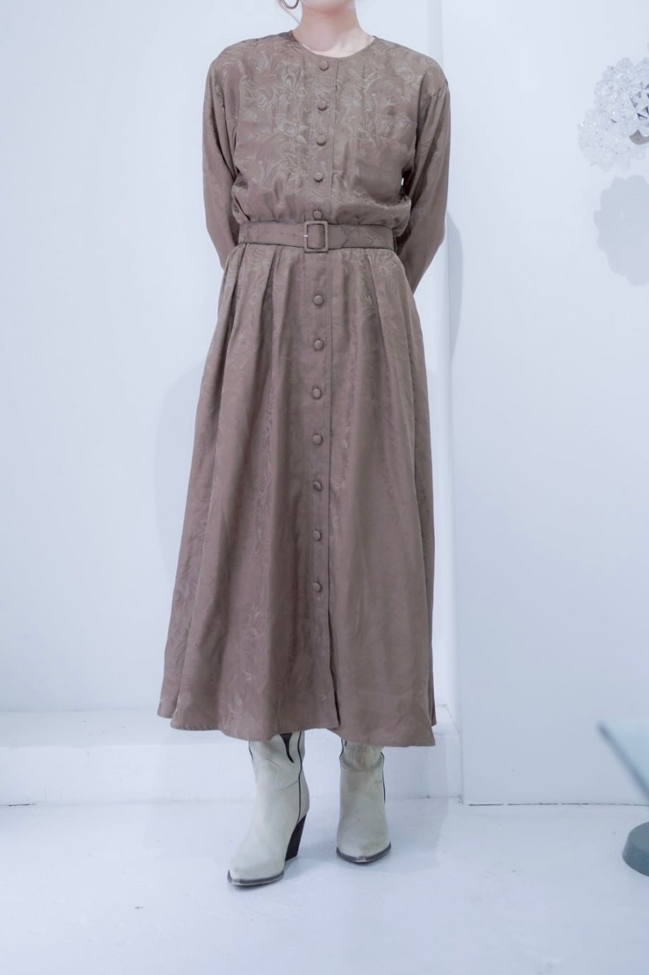 上品なプリント生地のワンピース。
