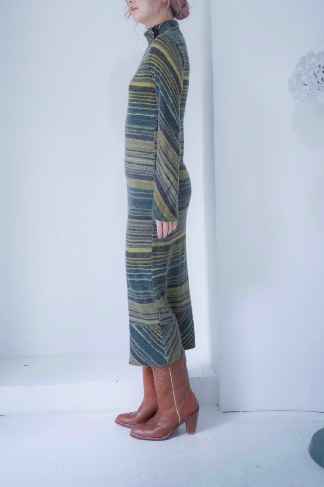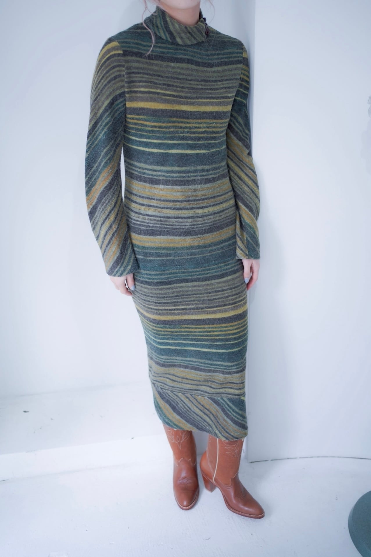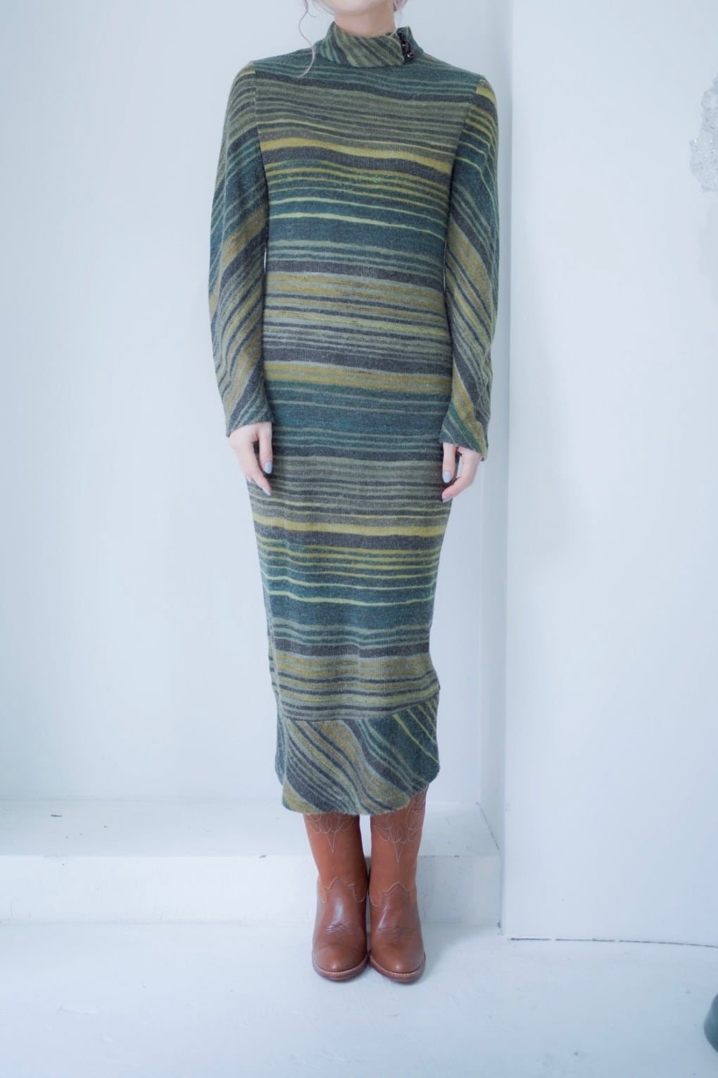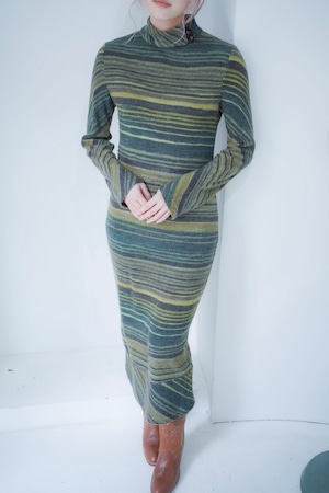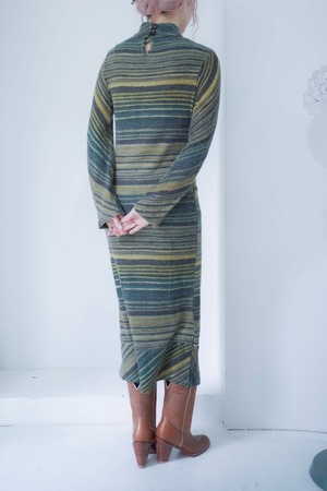 マルチボーダーパターンのニットドレス。