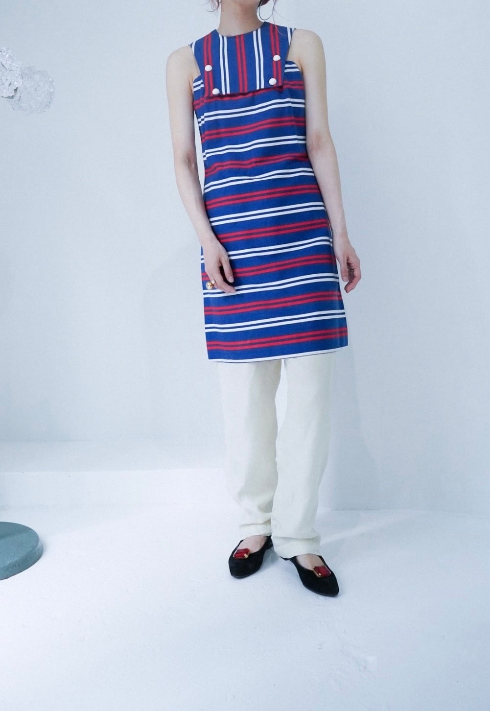 胸元の切り替えにぷくっと丸い白いボタンが